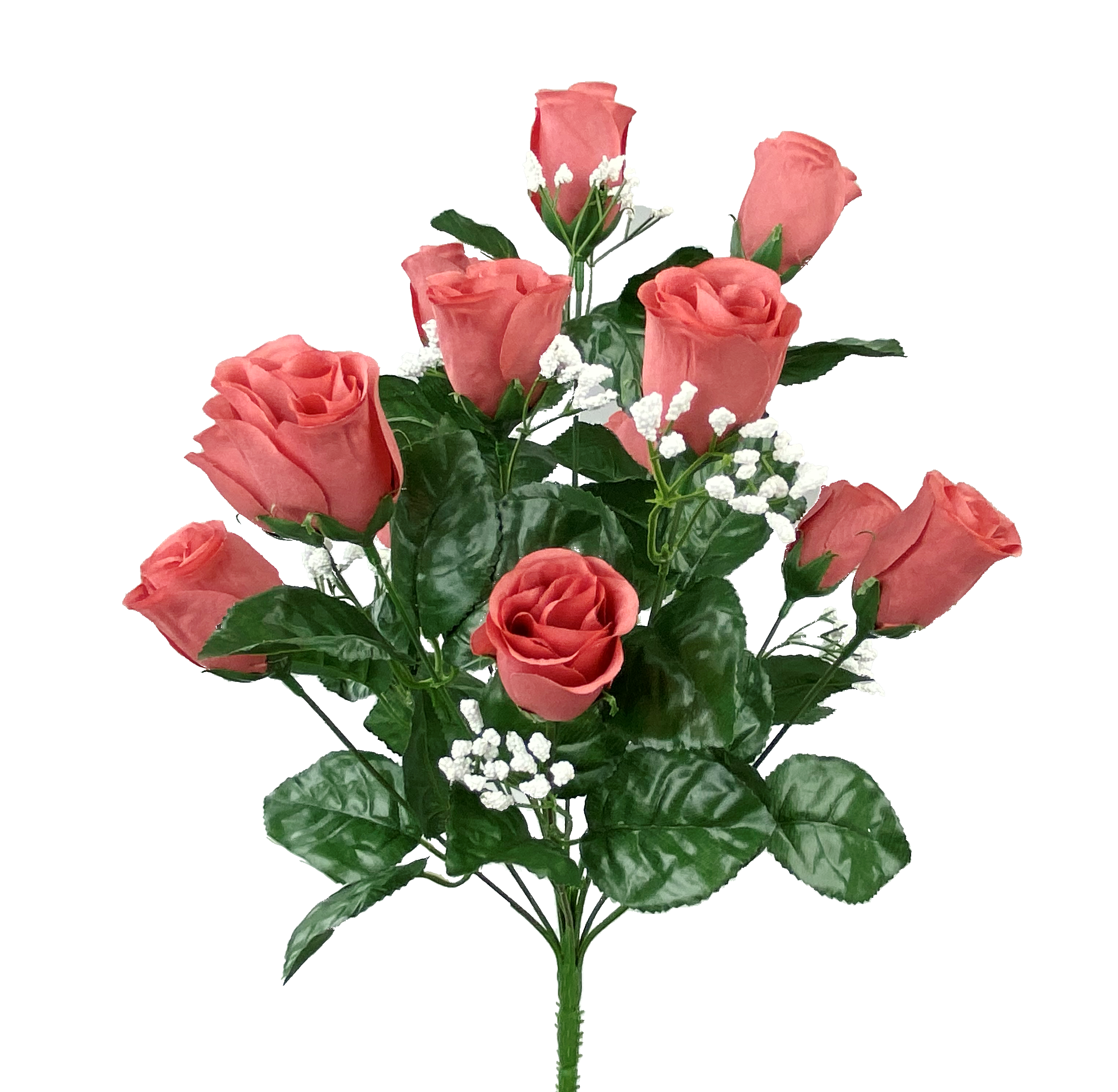 The Lillian Rose Bud Bush has 14 luxurious blooms in the just-opening stage. The colorfast fabric is made to retain it's color, even outdoors, making these beautiful roses a very popular and versatile option.
