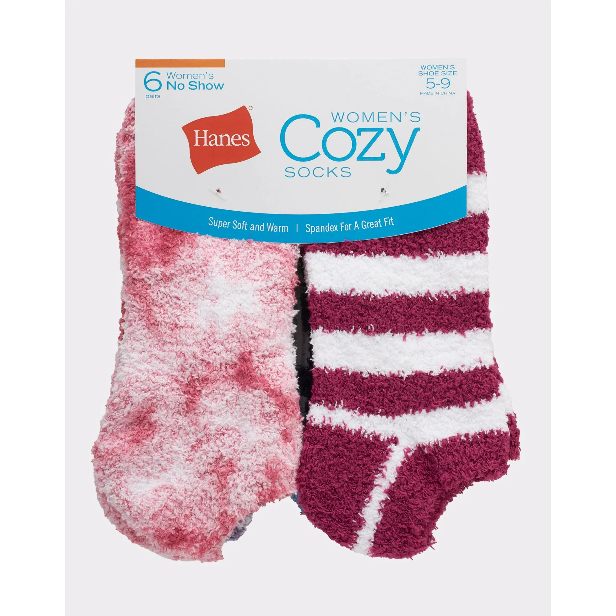 Treat your feet to ultimate comfort with this 6-pair pack of Hanes Women's Cozy Socks. Designed for softness and warmth, these socks are your perfect companion for lounging at home or adding a layer of cozy comfort inside your favorite shoes. The super soft, fuzzy texture provides a luxurious feel, while the Spandex ensures a great, secure fit that won't slip down. Featuring a popular no-show silhouette, you get all the warmth without the visibility, making them versatile for any casual outfit. This pack offers a fun variety of colors, including stylish prints and solids!
