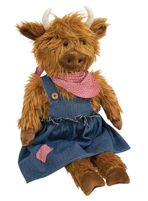 Our Hilda Highland Cow Doll is made of soft, shaggy fabric and wears a denim dress with patches and a pink bandana. This cute plush piece is perfect for featuring in an arrangement of farm-themed decor. Includes a vintage-style paper name tag. Has a weighted bottom for sitting display and measures 21" high by 10" wide by 3" deep.