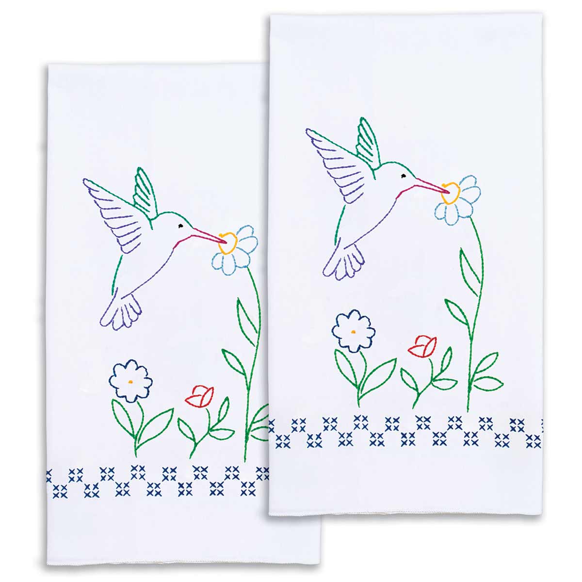 Each package contains a pair of 17″ x 28″ decorative hand towels, and embroidery design guide. Made of poly/cotton broadcloth.
