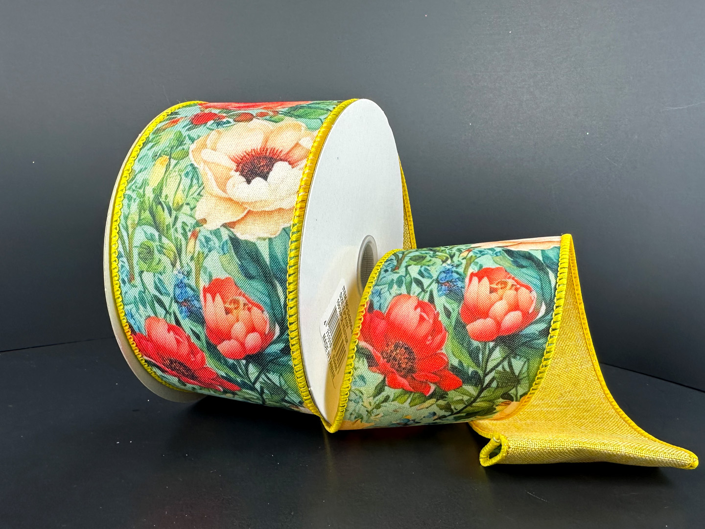 Bring the vibrant colors of a summer garden to your floral projects with this 2.5" poly linen ribbon. The design features a dense, high-color bouquet of anemones, lilies, and wildflowers in rich shades of coral, yellow, and cream. Framed by a textured yellow border and a matching yellow stitched edge, this ribbon is constructed with professional wired edges to ensure your bows and loops maintain a crisp, structural shape.