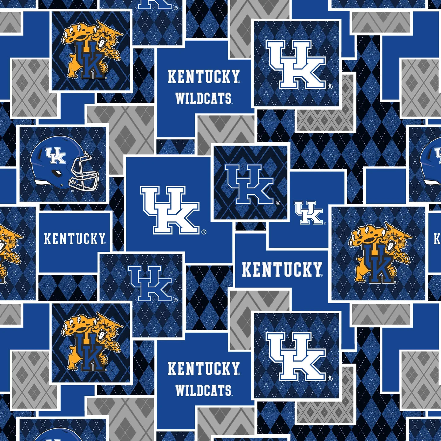 Show off your Wildcats pride with this officially licensed University of Kentucky cotton fabric. This unique "Argyle Boxes" design features a dynamic patchwork style, combining classic navy and royal blue argyle patterns with blocks containing the "UK" logo, the Wildcats mascot, and team helmets.