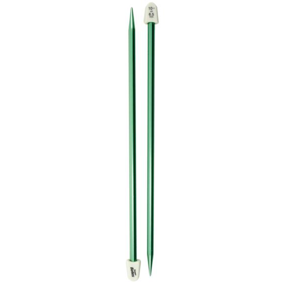 Susan Bates Silvalume lightweight aluminum 14-inch Knitting Needles feature a non-rolling knob design along with color coded sizes for quick identification. Straight needles are perfect for creating flat knitted projects or pattern pieces. This package contains one pair of 14-inch single point knitting needles. Size: 10.5/6.5mm.
