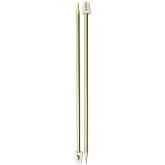 Susan Bates Silvalume lightweight aluminum 14-inch Knitting Needles feature a non-rolling knob design along with color coded sizes for quick identification. Straight needles are perfect for creating flat knitted projects or pattern pieces. This package contains one pair of 14-inch single point knitting needles. Size: 10/6mm