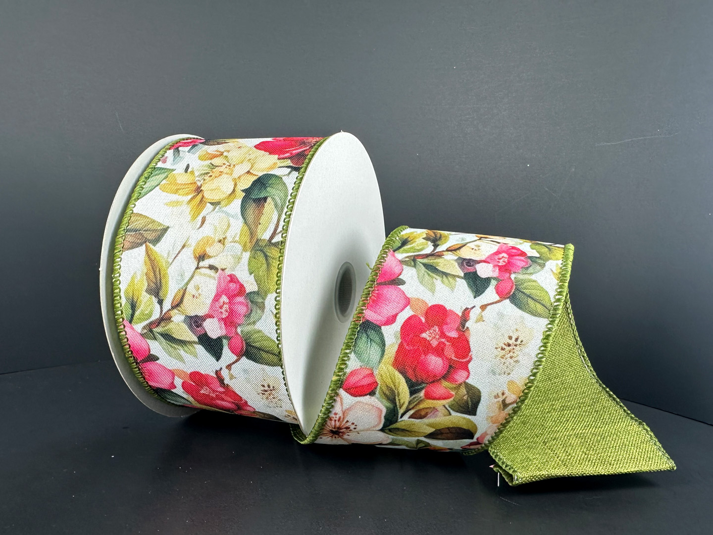 Bring your seasonal wreaths and floral designs to life with this 2.5" poly linen ribbon. The design features a lush, high-color print of blooming pink and yellow spring flowers nestled among deep green leaves and botanical accents. Finished with a textured moss green stitched wired edge, this durable ribbon provides the perfect structural support for creating large, vibrant bows that hold their shape beautifully.