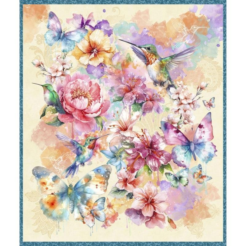 Capture the magic of a summer garden with the Flight of Fancy Focal Panel. This stunning 36″ x 43″ piece from White Owl Textiles features a breathtaking watercolor scene where delicate hummingbirds and vibrant butterflies dance among oversized peonies and lilies. With a soft, painterly palette of lavender, teal, and peach, it’s the perfect centerpiece for a serene lap quilt or a quick-to-finish wall hanging.