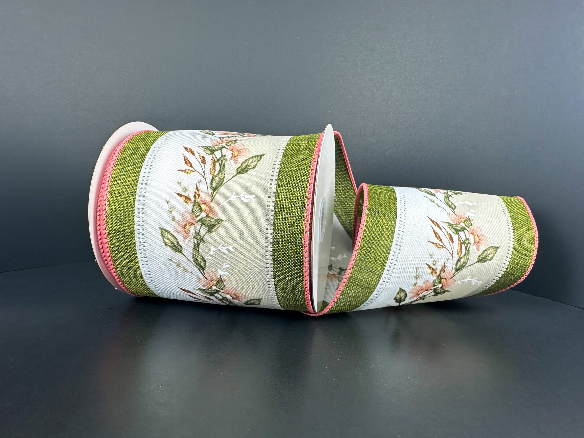 Add a touch of natural elegance to your floral designs with this wide 4" poly linen ribbon. The design features a delicate trailing wildflower vine in soft peach and cream tones, bordered by rustic moss green textured stripes and a decorative pink stitched edge. Its substantial width and professional wired edges make it an ideal choice for creating large, romantic bows and sophisticated spring or summer wreaths.